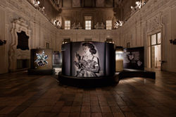 The softness of the forms in porcelain of the exhibits was the basis of the project. The rounded shapes of the bases, the transparent cylinder protecting and illuminating the objects and the translucent sails on which transfering large print texts and captions were the track on which to work. So the big showcases platform invaded the room of the Senate and, with the small building of the designs, seems shaped by uncontrolled forces shaking the space. The objects appear suspended between white clouds and shades nuances to mask bases and sources of light. The visitor is invited to slide along the sinuous course of a continuous belt, where each group of works is identified by a great graphics, as if they were immersed in a sky of clouds.
